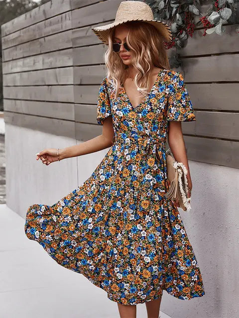 Whether paired with sneakers for a casual look or dressed up with heels and accessories, this knee-length dress adapts to any style. With its breathable fabric and flattering V-neckline, it's the perfect choice for summer wear.